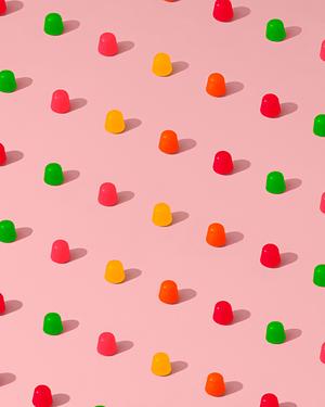 A repeating pattern of Dots Gum Drops candy on a pink background.