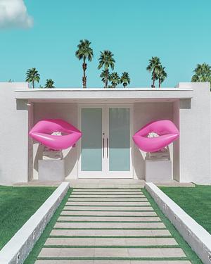 Mid-Century Modern home with giant blow-up pink lips at the front doors. Palm Springs, California.