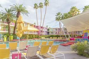 Colorful swimming pool area at The Saguaro Hotel in Palm Springs, California.