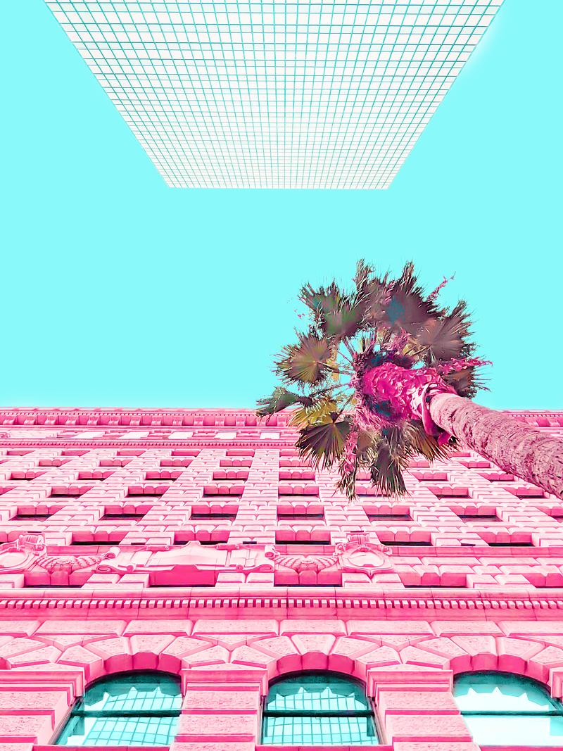 Lookup in Downtown LA with palm tree between old and new buildings. Los Angeles, California.