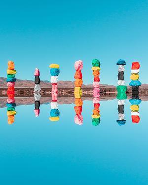 Mirrored reflection at Seven Magic Mountains in Las Vegas, Nevada.
